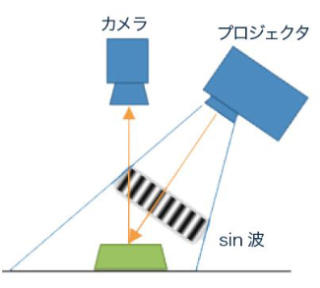 対象物に対してプロジェクタ等でサイン波を位相をずらしながら投影し、複数回撮像して得られる画像の輝度変化から位相を求める方法。