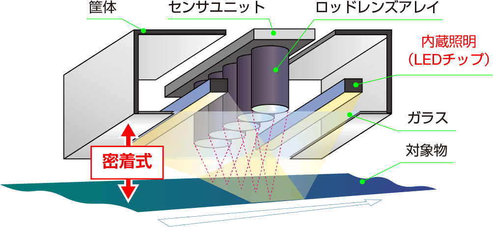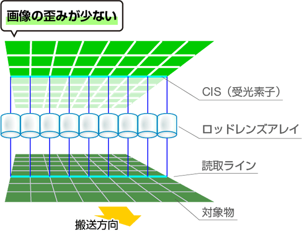 対象物を一列で走査するラインスキャナと似た仕組みでありつつ、ロッドレンズアレイを使用した密着型のセンサであるため、画像の歪みがほとんどありません。エリアカメラによる撮像では画像の周辺部がぼやけてしまったり画像の結合が必須となるような大型の対象物でも、鮮明な単独画像を取得します。