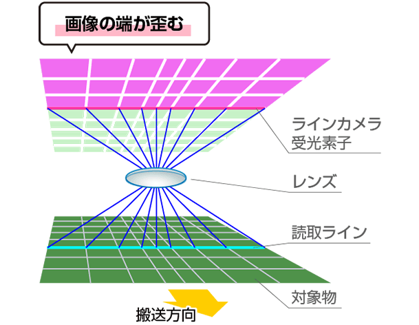 ロッドレンズアレイとは、複数のレンズを一列に並べた構造です。センサとレンズが接触している設計のため、エリアカメラやラインカメラのようなレンズ中心と周辺との「収差(ディストーション)」が発生せず、均一で歪みの無い画像が取得できます。
